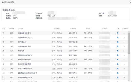 下侧列表显示船舶持有证书,点击下载图标可下载证书。