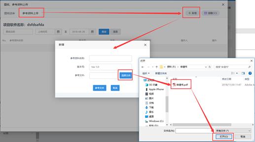 如果需要上传参考资料,则点击参考资料上传分页按钮,点击新增按钮,如下图所示进行上传: