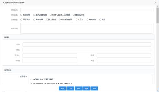 根据需要的海工审图服务点击相应的菜单按钮,这里以“海上固定设施”为例,点击“海上固定设施”,出现如下图所示界面: