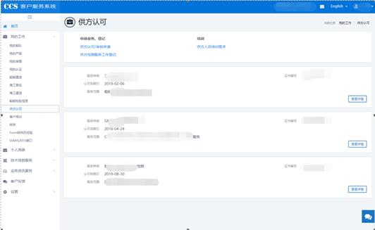 点击我的工作-供方认可菜单,进入页面,页面下方可看到自己企业持有的供方资质,点击“查看详情”按钮,可查看资质的详情。