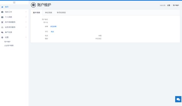 用户维护自己的账户信息,修改办公电话,传真、工作地点,调整账户关联手机号码、邮箱等。