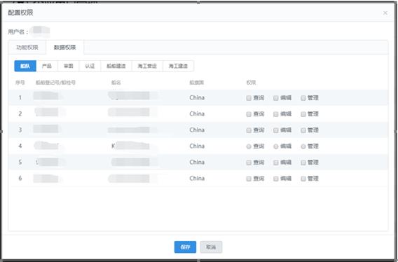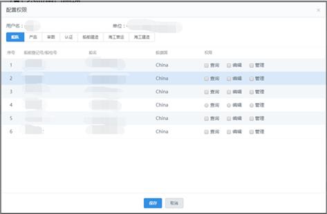 3. 授予企业用户数据权限。对不同类型客户,展示当前客户所有的可查看的船队、产品、审图、认证、船舶建造、海工营运、海工建造数据。选择需要授予的数据列,保存即可。