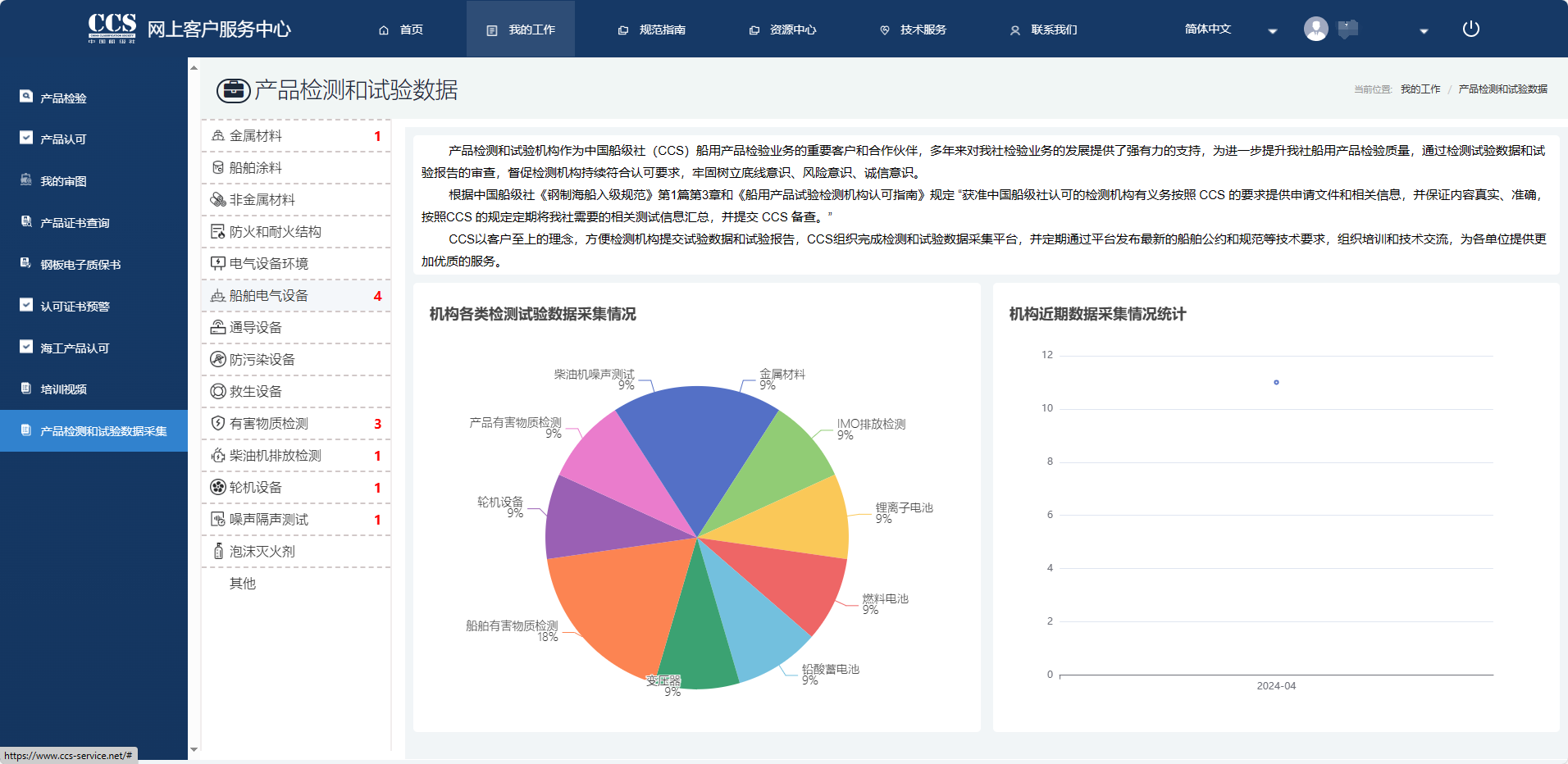方式二:页面上方选择【我的工作】,右侧点击【产品检测和试验数据采集】,进入产品检测和试验数据采集页面。