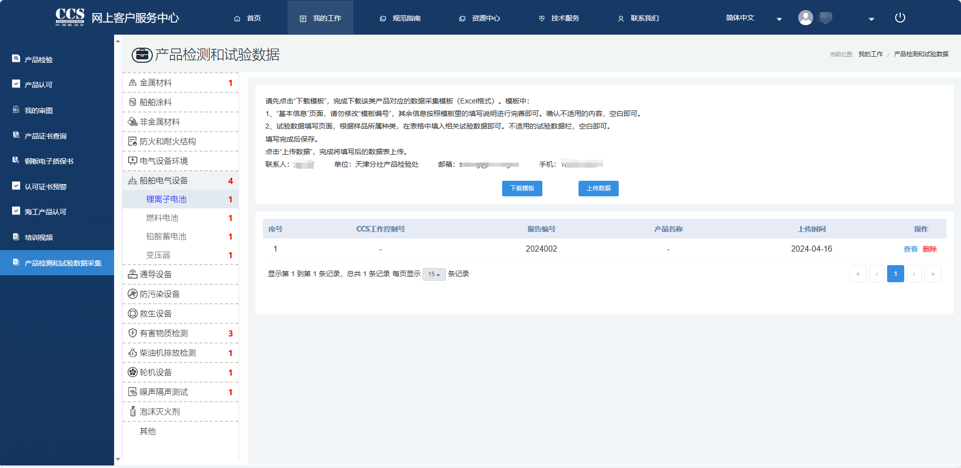 左侧菜单选择检测和试验产品类型,页面中点击【下载模板】