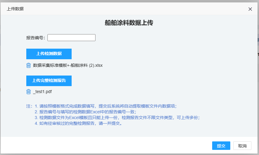 确认检测数据和检测报告文件,点击【提交】完成本次数据采集工作。