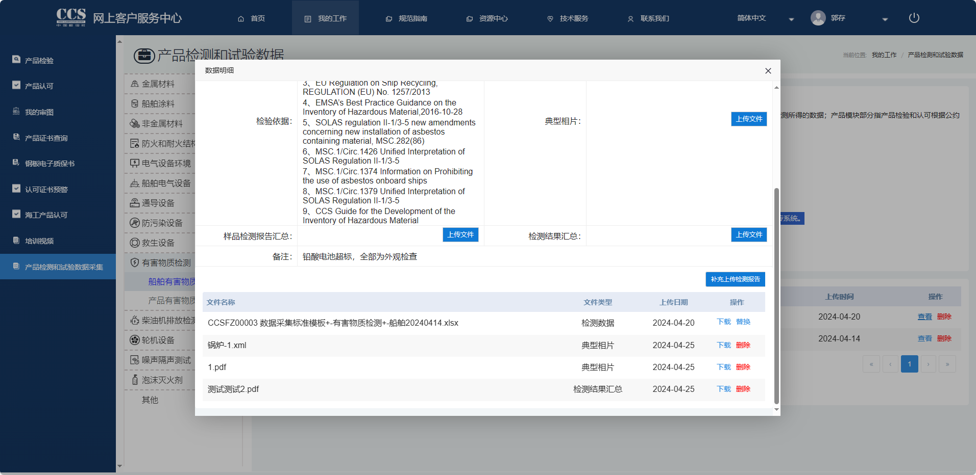 其中,有害物质检测数据采集除填写EXCEL数据部分,船舶模块的”有害物质外观和取样计划”、“编制完成的IHM清单”和“试样检验报告”,以及产品模块部分的“试样检验报告”作为外挂文件上传系统。